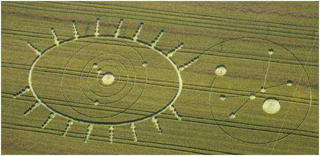Зайцев встречало, а пар от зубов Тифоеевых чудищ. Круги на полях. Англия. 20. 06. 2012 г. Земля, звезда с "хвостом" (в таком виде ее изображали на некоторых наскальных рисунках") и Луна. В 1972 году в одном из монастырей в Болонье была найдена рукопись, так называемая «Вечная книга», в которой дается прогноз развития нашей цивилизации до 6323 года включительно. В 1981 и 1984 гг. в Италии была издана книга Б. Башера с текстами рукописи Р. Неро с подробными комментариями. Вот одно из предсказаний монаха: «На небе будет два Солнца и две Луны. Не будет ночи. Земля превратится в пылающий ад. На земле невозможно будет жить. Лишь в воздухе и под землей будет спасение живущим. Будет построено восемь подземных городов. С гор будут спилены вершины. Люди смогут жить лишь на горах. Многие люди ослепнут от света двух Солнц; Поднимутся огромные волны. Они затопят половину земной тверди, а затем откатятся (приливная волна). На севере снега и льды растают. На полюсах появятся обширные цветущие земли; Новая Луна будет меньше размером и ближе к Земле, чем старая Луна. Новая Луна будет так же хорошо видна с Земли, как и старая. Когда люди увидят на небе свет двух Солнц и двух Лун, тогда придет на Землю Антихрист – Сатана на коне с тремя головами. Новое Солнце будет покровительствовать религии Сатаны».